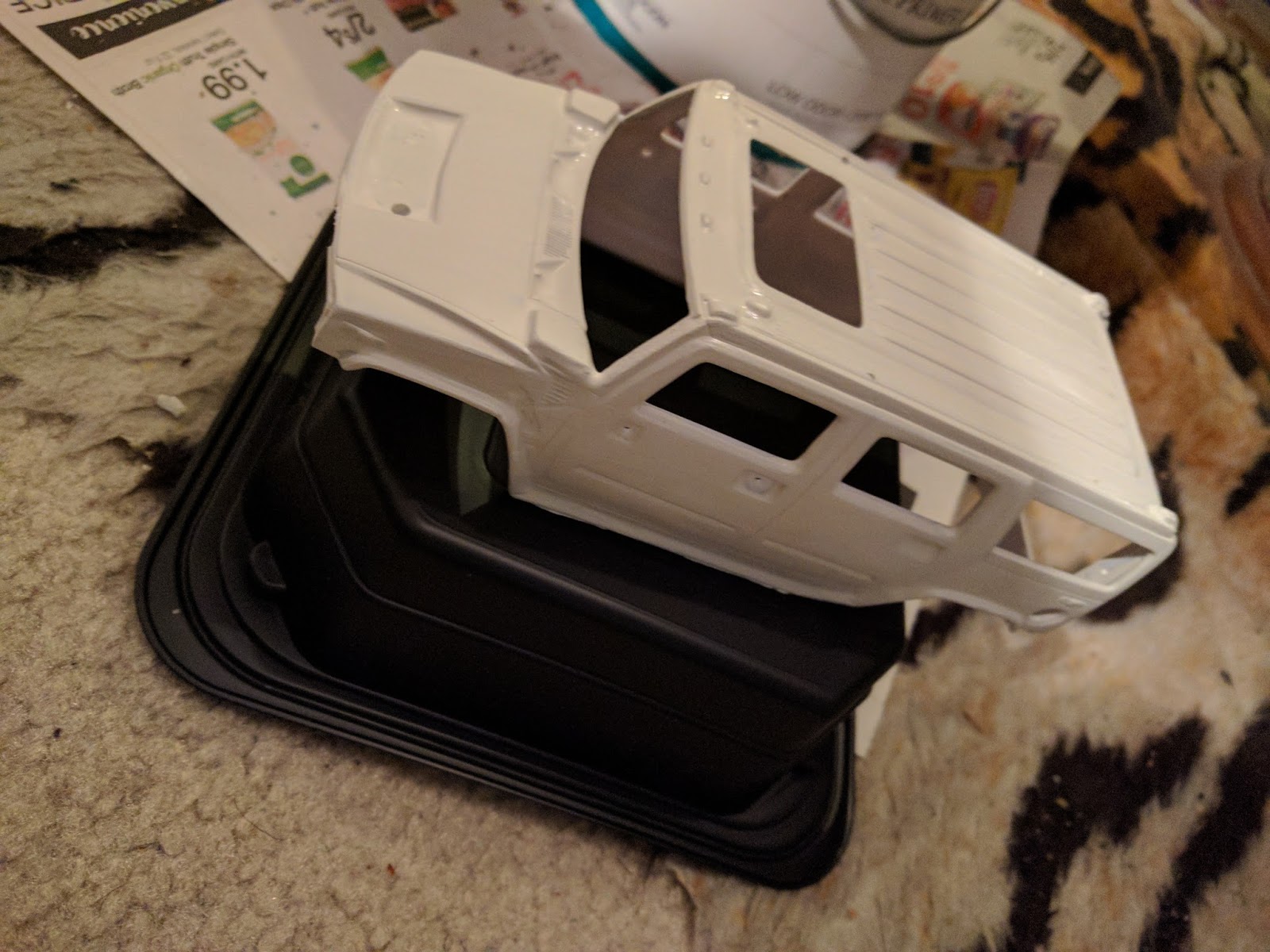 Nevertheless, I am proud of the outcome. This toy SUV doesn't roll fully, per the glue I added in one of the axles, but I don't care. It was created as a display piece, not a rough-edged play toy. I almost wish that I had chosen to build something easier, as my premier model vehicle project. But on the other hand, per the tough obstacles that I encountered and conquered during the assembly, I'm pleased with the experience points that I gained.