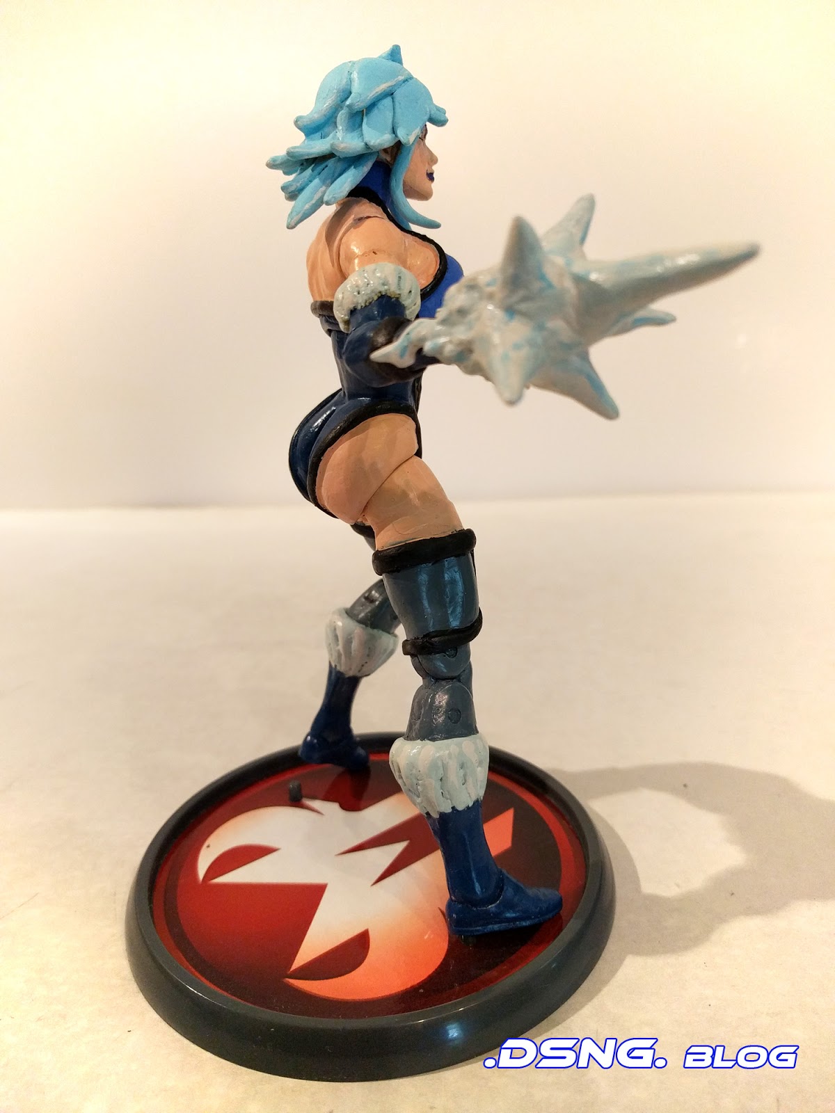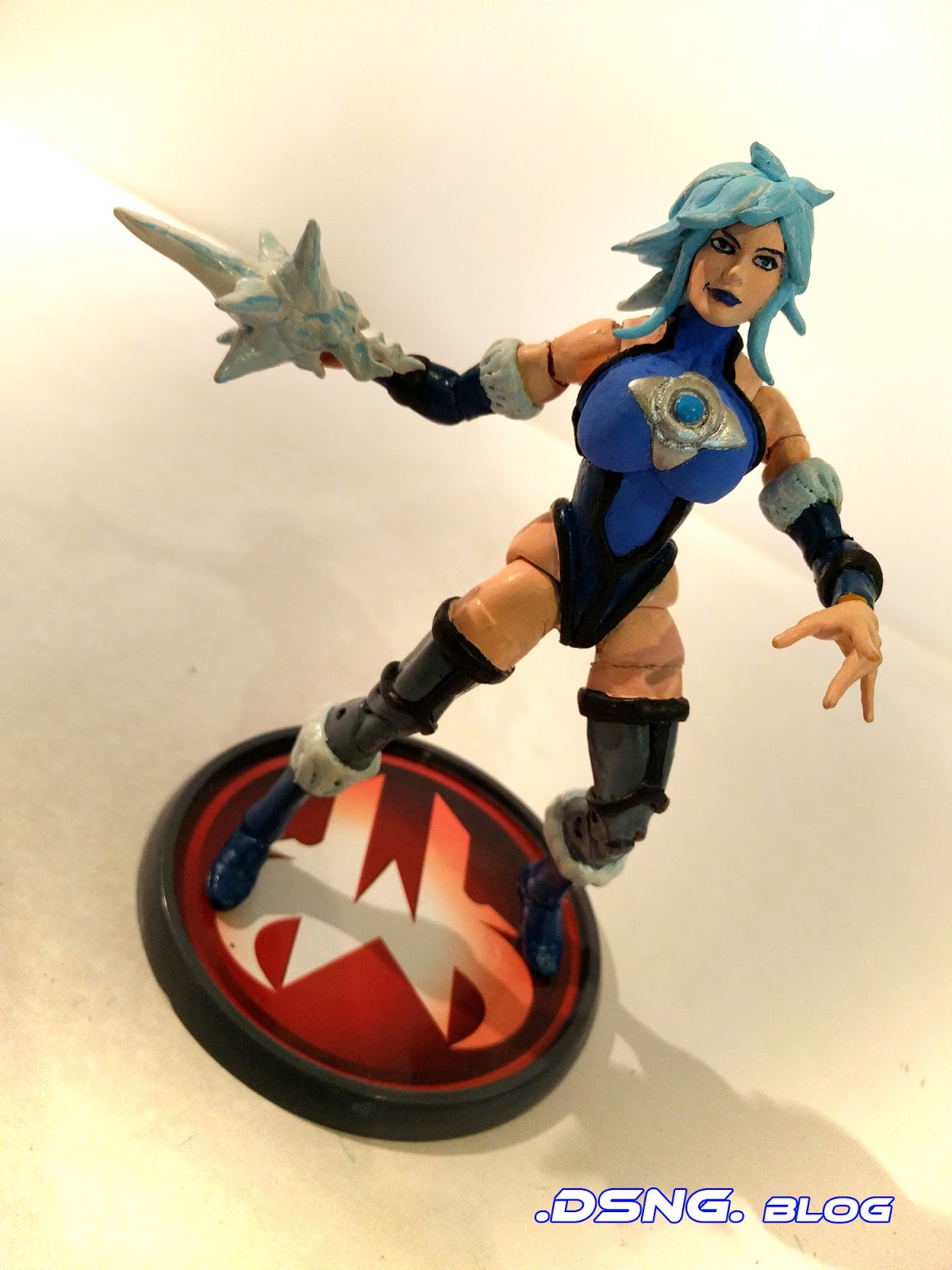 The base figure that I used is Marvel Legends Captain Marvel [Carol Danvers, shown over Here]. And I had to use putty to sculpt her black lines, and her boobs and booty. And her hair was fully sculpted - so it's hard, and it doesn’t move. The ice spike that I created for her hand was based on the semi-transparent "energy fist effect" that ca,e with the Captain marvel toy. I had to sculpt some sharp points for the spike and them glue them to the top o the energy fist effect. And then I painted the whole thing white and added two shades of blue as highlights. She can stand on her own, but I used the "House of M" toy stand just to aid with balance, as I spun her around for the pics.