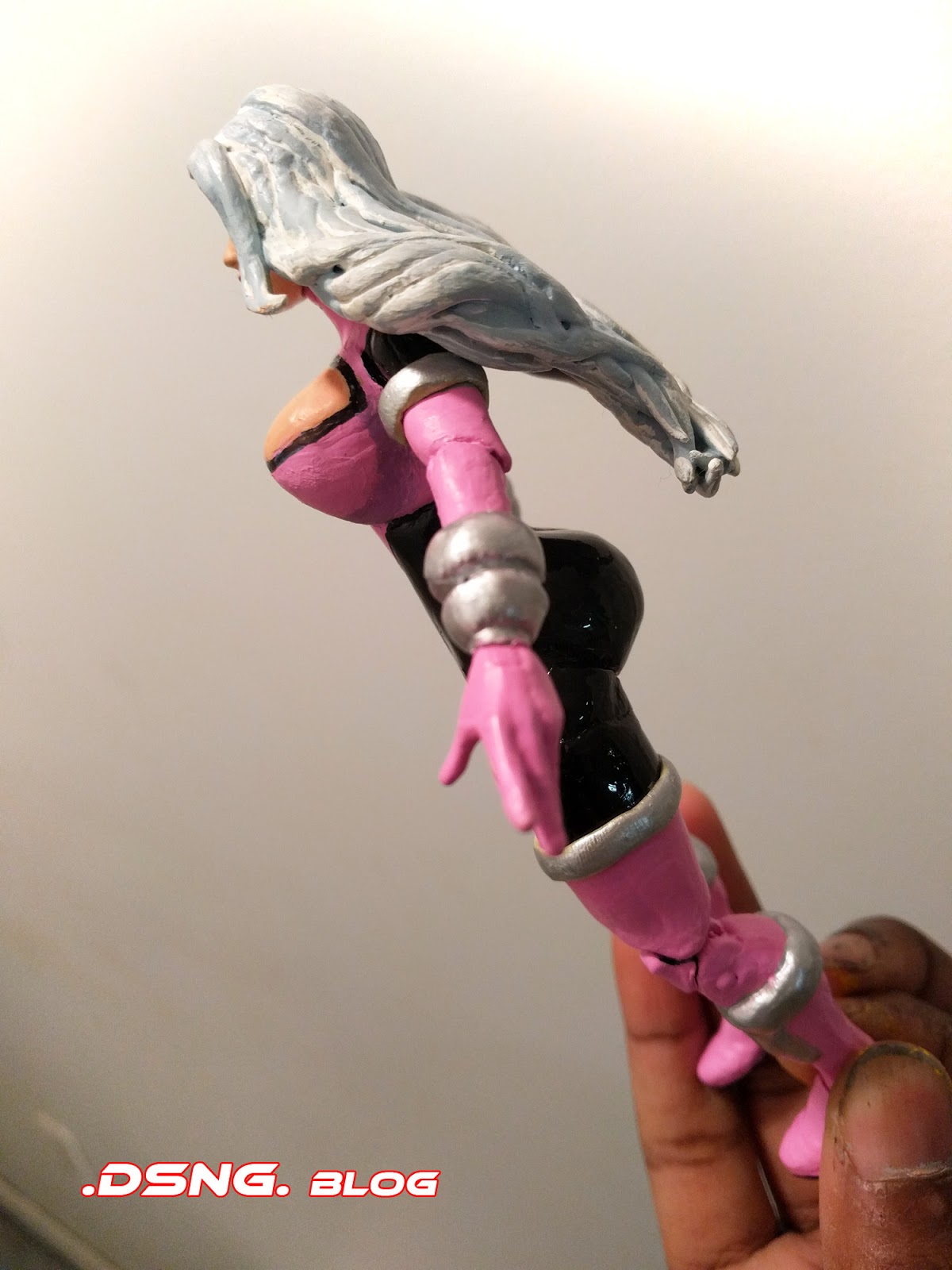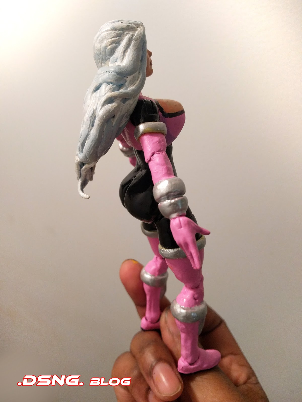 And she was already shapely per the toy mold; but I repainted her with a darker gloss black and I painted her gloves and boots with a brighter acrylic white - as shown on the left. But before repainting her, with some blue putty, I gave her a bigger butt. Because I can. LOL.