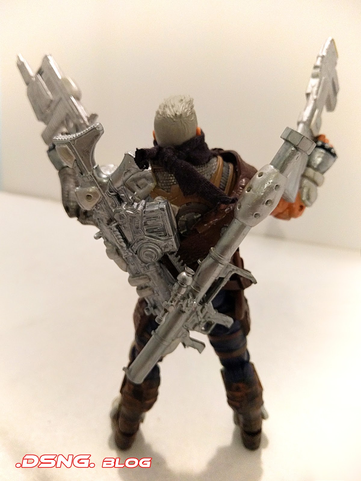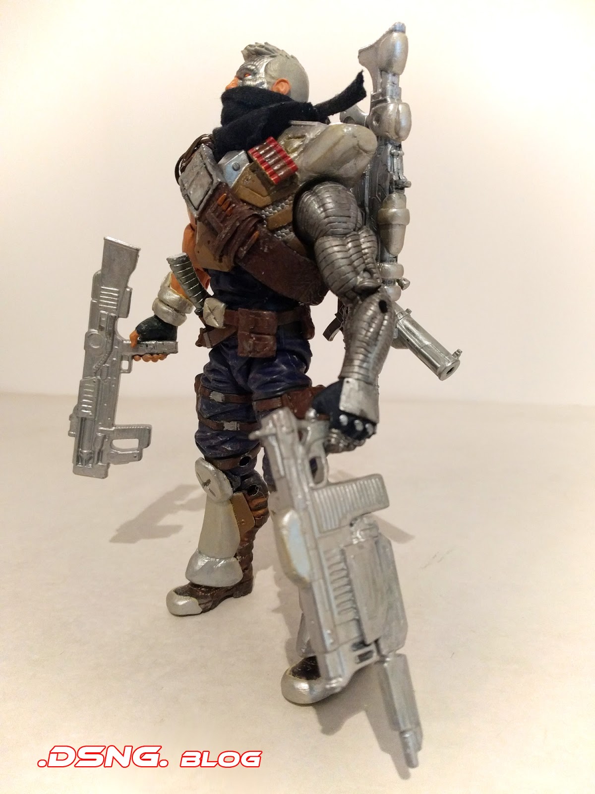 And I repainted and modified Cable's standard guns [the two large ones that he holds in his hands]. Plus I added two more guns to his frame [one is a rocket launcher taken from Deadpool and the other is from the Gears of War toyline]. Plus I added a dagger to his right hip from the Nuke toy, while I added a "stone-wash effect" to his blue pants.