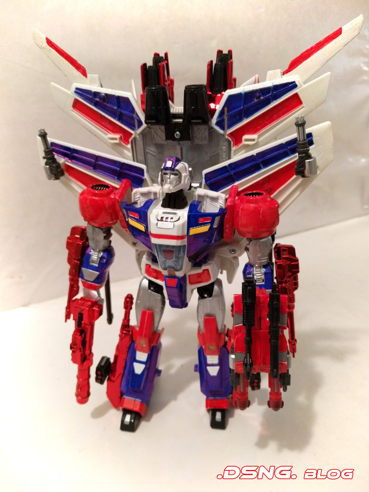 Here is a custom paint job that I did for the Transformers Generations Leader Class Jetfire toy. It was completely white when I started, as you can see in the "Before" image, shown on the right side. I decided to go with the "Captain America Patriotic" color scheme. And I utilized sharpie markers and acrylic paints. But amidst my coloring, I left his back predominantly white, so that he can still transform into the white F22 raptor jet. And I added some small cut-out plastic pieces, which were colored as yellow lights on his chest, and also as emblems glued onto his forearms and his shins. Although his backpack is rather heavy, he can stand with no problem. But I may add some putty later into the base of his feet, in order to make him more stable. He has some extra Gundam fin-wings [red and white colored], added to his regular wings on his back. He did come with several weapons and the twin shinny-red blaster cannons attached on his back, in the center. But I also added several Gundam weapons [the long black back-cannons], plus compact gatling gun weapons from some of the third party Iron Factory sets. The gun in his left hand is a custom combo of various weapons. I often tag these kitbash / custom toys with the tag of Gundamformers, and this is why....