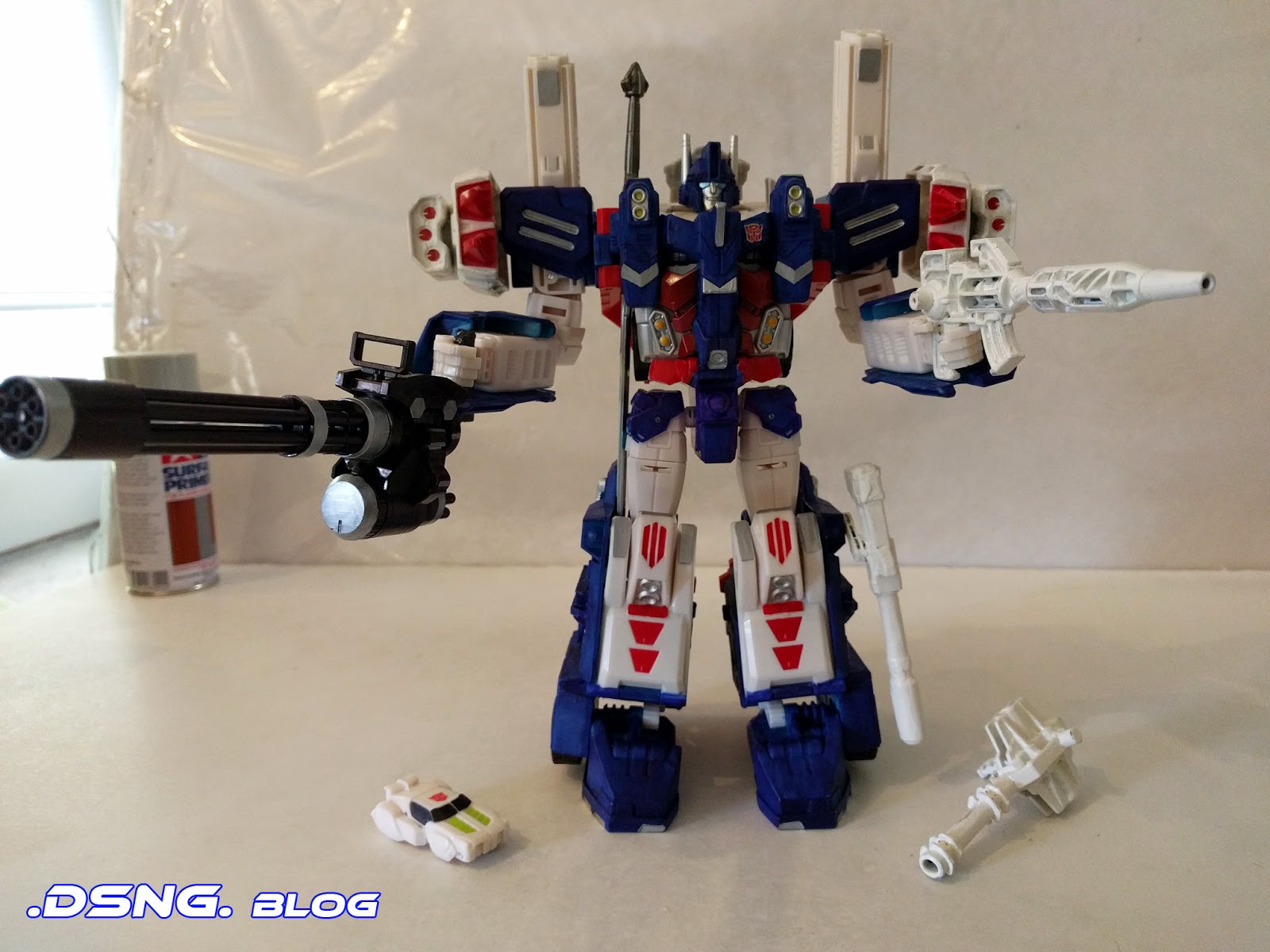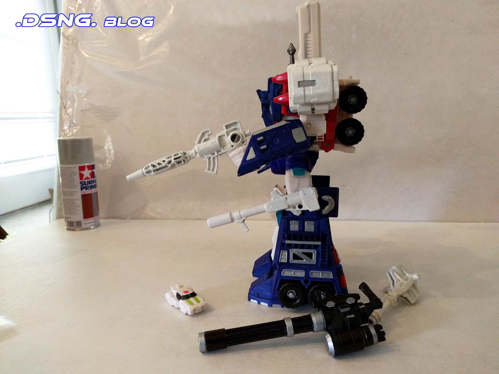 The original base model was the Combiner Wars Leader Class Ultra Magnus toy; it has a powder blue / Easter blue color, and... it almost looks like he's not wearing any pants, or undies...Anyway, I had to color him all over, with silver, ultramarine blue, red and some white... and even his shoes got some silver paint [shown in the side view]. Plus the back of his pants were colored blue, after adding some putty to fill in the hollow spaces back there. The two black weapons that he came with, shown in the before pic, had to be colored white as well. Honestly, I've never transformed this guy. And I probably won't... but yeah, he isn't glued tight, so he can change to a hefty vehicle carrier-truck thingy. Its just that I had no interest in the mack-truck mode, for the customization that I had in mind.