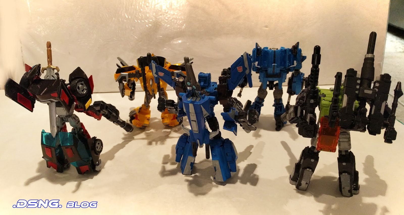[image error] Today I'll show a group of five Transformers [with two different Bumblebee molds], in a Mexican standoff. I've shown most of them before, except for Hardhead [the green guy] and Brainstorm [the blue jet-looking guy]. They've all been customized in one form or another. My custom metallic blue guy, Turbo Blitz, was a repaint and a heavy modification of the Fall Of Cybertron Sideswipe. And I posted that article over Here.