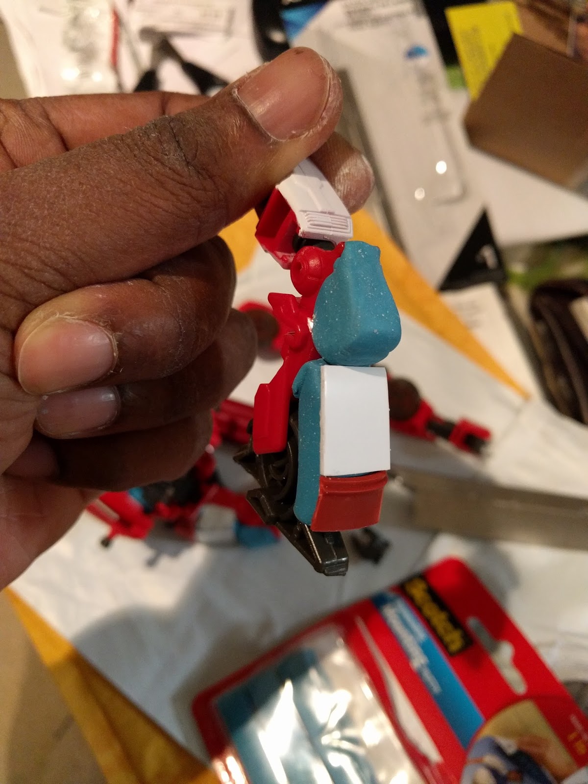 For my other tools, I needed blue metallic paint, white stickers, silver metallic sharpies, gray metallic paint, and a compact SAW, along with lots of glue and putty. I also needed to buy some small 1-inch hinges from Home Depot, because I wanted to attach the Mercedes SUVs car doors to the back of the custom toy. The hinges were glued into place.And here are the pics to show the work done to the re-assembled limbs and the body of the robot. Even the toy's face needed a new face-mask, like the one that Optimus Prime uses. So I made that from some slim plastic, like the kind that you find at Publix or Kroger - it is used to package fresh cookies for sale, or doughnuts ;)