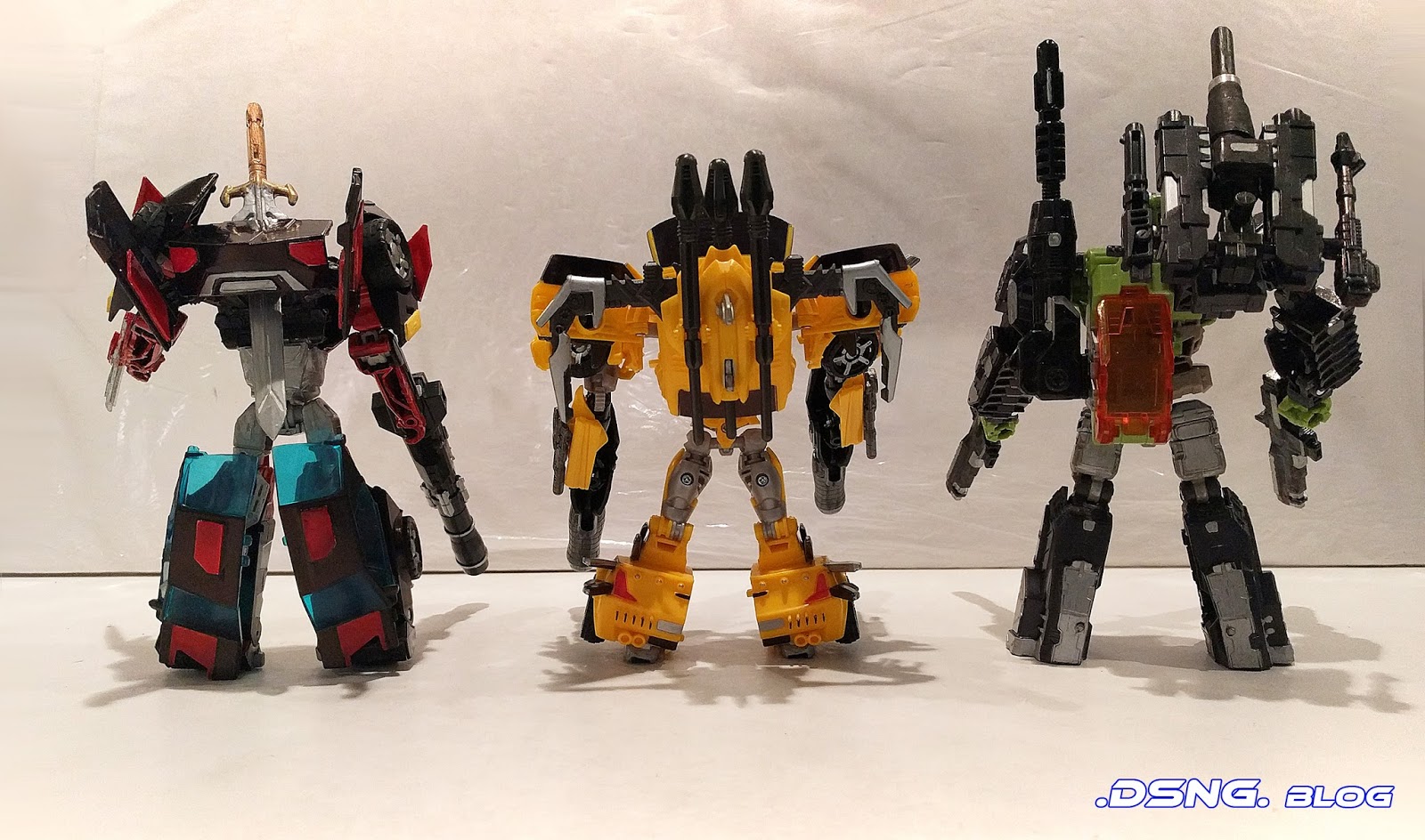 And the yellow Beast Hunters Bumblebee was touched up with silver and black paint. His two heavy guns are from The "Dr. Wu" line of Optimus Prime blasters. I actually like this guy and he has a way of shinning amidst his peers; so he was used as a center piece for the Mexican standoff.