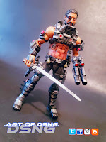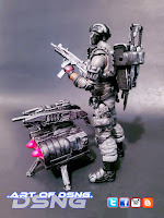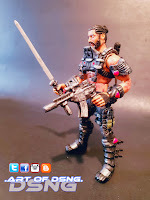 The 6-inch scale base body was Mustafa Ali from the WWE elite toy line. His body armor was sculpted, along with all his gear and his backpack holster - which holds two blades from the Baroness toy. His twin barreled machinegun was custom made, from weapons I bought on ebay. And his sword is from Taskmaster.