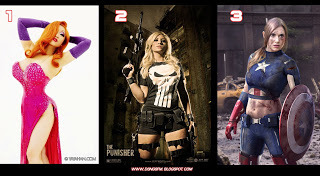 The first pic on top features Denise Milani as a busty Wonder Woman from DC comics. The second is Courtney Black as Ms. Jessica Rabbit. The third cosplay pic of Poison Ivy is by Pamela Isley. The fourth is Mad Moxxi [from the video game Borderlands 2, DLC; and I set up the pinup as a motivational poster]. The fifth poster features Batman and Catwoman. And the sixth wallpaper features Yaya Han, also as Ms. Jessica [and she is with two other lovely young ladies, don't know their names].