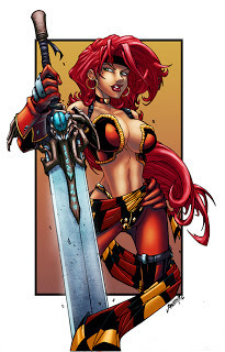 And although she was technically a supporting character, Red Monika became far more popular than Garrison [who was tagged as a legendary swordsman with a powerful magical sword]. And over 10 years after the comic book series [which was plagued with production delays and ran for just 9 issues], there are still tons of pics of Monika on the Web. It appears that aspiring artists can seem to stop paying tribute to her dangerous curves.