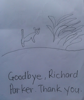 We saw Life Of Pi over the weekend. Ikesha loves Richard Parker and pretends to read my book Life Of Pi. This morning, before I left for work, Ikesha asked for a smaller (simplified, I guess) Life Of Pi book. So I told her our next project would be to make a Life Of Pi book she can read to herself. I will do the words based on the story using words Ikesha can manage - and Ikesha will do the illustrations. We will keep you updated.