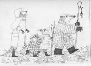 It’s been such a privilege to work on this beautiful book and I hope people will enjoy reading it as much as we have loved creating it. I hope readers will find favourite moments and I hope those moments will stay with them. I’ve discovered a new favourite and it’s a real keeper. It’s the moment when Ratty and Mole find Badger’s home after being lost in the snow. Badger opens the door and greets them both with a little pat on the head each, saying, “This is not the sort of night for small animals to be out.” There is a huge amount of affection in these simple words. Badger might seem a little gruff, but he is full of love for his friends and, for me, that is the key to The Wind in the Willows – it’s packed with adventure but it’s also all about love and friendship. So perhaps my favourite image has to the last one of all, where our four heroes wander through the woods, fixed forever in time as a band of friends who would do anything for each other.