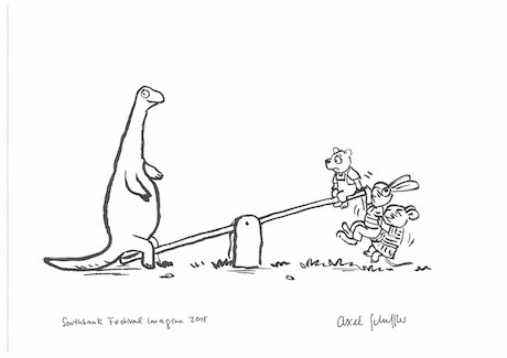 A couple of week ago, Pip and Posy illustrator Axel Scheffler led a fantastic storytelling session to a packed house at the Southbank Centre as part of the Imagine Children’s Festival. And today we’re very pleased to say that we’ll be auctioning some of the work that Axel produced on the day in aid of charity. There are six different pieces available to bid on, featuring some of Axel’s best-loved characters, with all proceeds going to War Child.