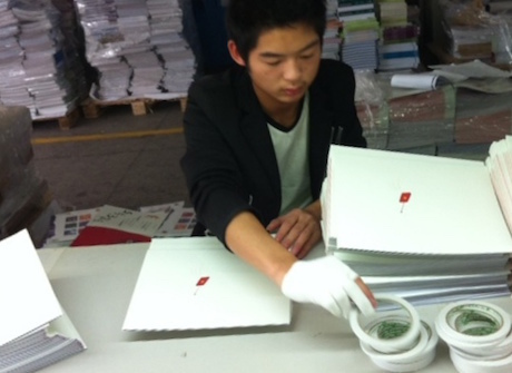 Li Yin, 18, from Hunan Province, works on the fold-out page – which has to be tipped-in by hand – in the Dutch edition of Use Your Imagination in a factory in Shenzhen