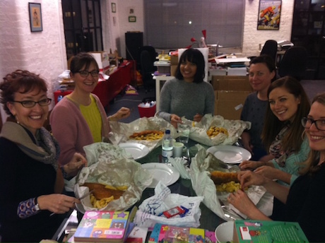 Fish and chips break during a late evening preparing material for the 2014 Bologna Book Fair