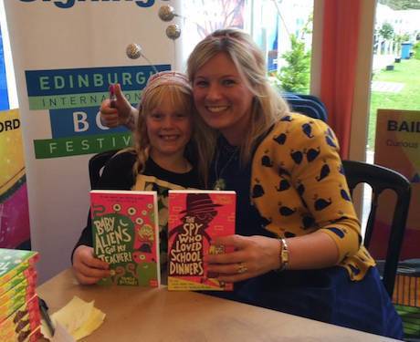 Pamela Butchart signing books for a fan at the 2014 Edinburgh Book Festival