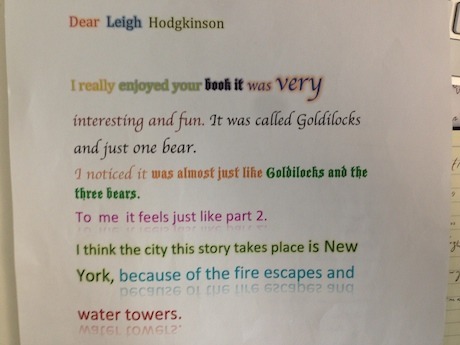 “I really like this book because it was switched with Goldilocks and the three bears … I thought this was going to be the same book. But it was different. My favourite character was the Bear. I like how you had him leaving footprints that he was not aware of. I also liked it when the Bear sat on a cactus and said, “This chair is too ouch”. That is a creative word. I also liked to see that the world wobbly is written in wobbly font.”