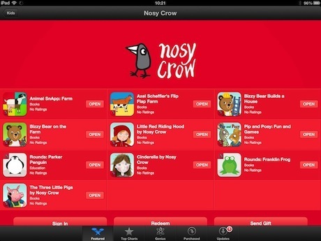 We’re also one of the very, very few developers (the others are the likes of Disney) to have our own, branded page on the App Store, dedicated exclusively to our apps. Here’s a look at ours (with a wonderful, Nosy Crow-red background):
