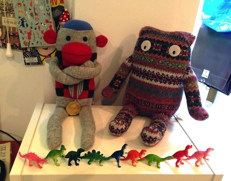 On the left meet Sargent Dave: Military Monkey seen wearing his medal of honour. He is my enforcer and main source of motivation. Never have I missed a deadline under the watchful eye of Dave. Next you can see Jumper Monster on the right, whose more louche attitude reminds me of freedom of creativity and provides both comfort and solace. He’s also really, really furry. Lastly in the foreground there’s the Rainbow Dinosaur Parade who, frankly, are there just for fun.