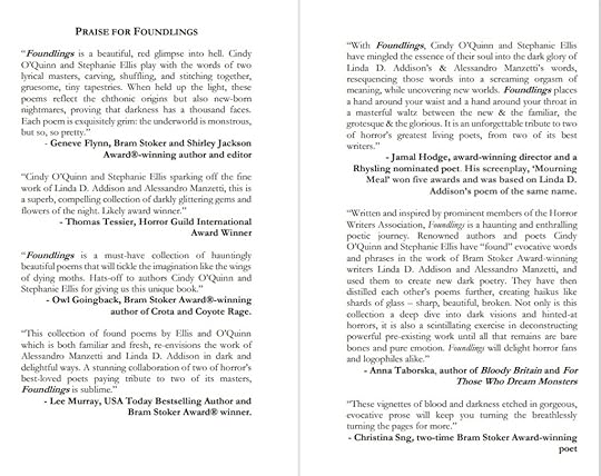 I was delighted to learn that Foundlings, the found poetry collection written by myself and Cindy O’Quinn, has made it on to the HWA Bram Stoker Awards Preliminary ballot in the Poetry Collection category. This does not mean it has been nominated, but that it does have a chance!