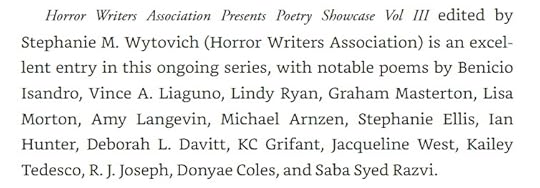Noted editor, Ellen Datlow’s Best of Horror anthology is one which many authors would love to be included in – and if they don’t make the final cut, to learn they’re on the longlist is an event in itself. This year saw a major step forward for me personally in that I achieved the latter! Some wonderful person put the HWA Poetry Showcase Volume IX forward and my poem, Death Mask, was selected for the list. This in turn has given me the confidence to submit some of my published work from this year for next year’s consideration.