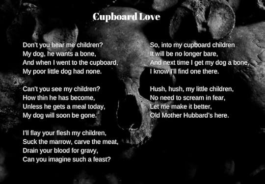 A few years back I rewrote a nursery rhyme, just for fun. That rhyme was a version of The House that Jack Built which I gave a Ripper vibe. It appeared on a defunct website called Readwave and I wrote a few others. These were all well-received. Over a period of time I wrote about 25 more and gathered them with my dark verse in my collection, Dark is my Playground. I always intended to expand on these, presenting a somewhat darker edition of Mother Goose and so I’ve written another batch which allows me to gather old and new together in One, Two, I See You. This collection contains sixty twisted rhymes – although how you make some nursery rhymes darker is beyond me, I mean Three Blind Mice? Well, actually I did it but you get my drift, a lot of nursery rhymes are alreaady pretty dark and often violent.