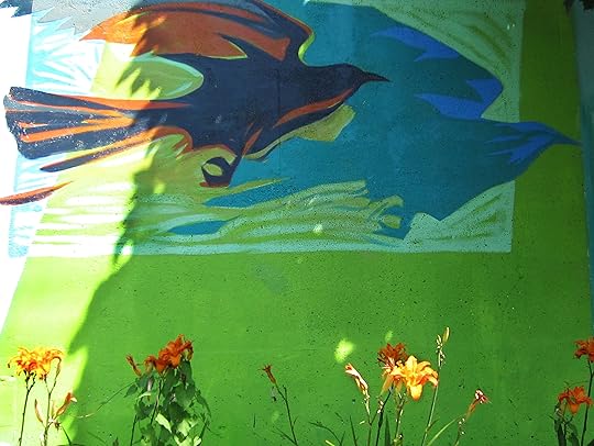 It's no wonder that recently in a community beautification project, that crows feature largely. Britannia Centre includes a high school, day care, library, park, year-round skating rink, swimming pool, gym, courts and other areas. The school grounds take up several city blocks and on the west side there is a large retaining wall. A few years back, they rebuilt it and people have been trying to do some community gardening there though it's been sporadic.