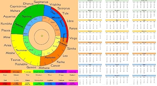 Doing the math, I found that a week of 5 days, a three-week month, 15 months, and a “leap year” every 10 years (where it’s actually three days shorter) would work. And the months and days all take their names from different cultures and the names they ascribed to the planet Venus or the associated fertility goddesses.
