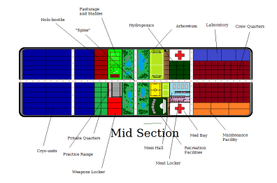 Note the segmented layout and extended middle section. This layout places the control module at the front with the bridge, navigation and whatnot, while the engine compartment, storage and shuttle bays are located at the rear. The middle section, which is an O’Neil Cylinder, is the habitation module, which rotates to provide artificial gravity. Here is where the crew sleep, eat, enjoy their leisure time, and ensure that they don’t suffer from the effects of muscular atrophy or osteoporosis.