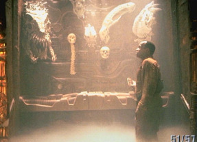 This chase eventually leads Harrington into the underground space beneath an apartment block. He falls into darkness, and lands on what is clearly their mothership. Proceeding inside, he sees the Predator’s trophy case, resplendent with different skulls. He’s almost killed when the Predator surprise attacks him, but manages to defend himself long enough to deliver the death blow with the Predator’s own disc.