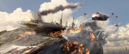 We cut, as usual, to ships in space. And after a brief, silent flyby, we see that its in fact some mad space combat! Ships everywhere are engaged in close quarters combat, destroyers, cruisers, and tons of fighters between them. And it’s all happening over the capitol. And to top it off, Skywalker and Kenobi are there too, leading the assault in their fighters.