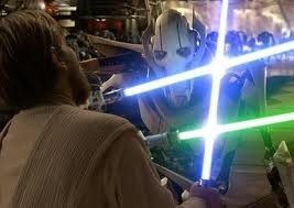 After a big chase involving a giant lizard, a ZOOM, and a cliffside fight, Anakin blows Grievous away with a blaster. In a shout out to remarks made in the first movie, he then mocks the weapon that saved his life. Seems kind of callous…