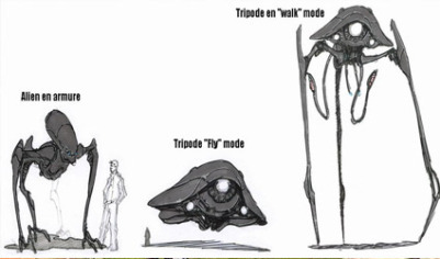 Every unit is based on the same quadrupedal configuration with two three-fingered hands which double as machine guns. They carry their sensor equipment in their “heads”, which consists of a large main lens and two sensors mounted on the “mouth” below. Heavier weapons can also be mounted on the underside, which can either be a heavy machine gun or a grenade launcher.