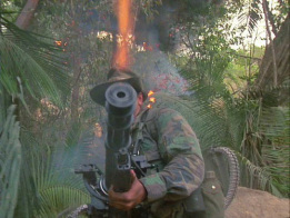What follows is some obvious build-up as the team discovers the crashed chopper which was supposedly holding the minister and his aides and finds a whole bunch of skinned bodies hanging upside down. Assuming the guerrillas did this, the team sets off post-haste for their hideout with payback on their minds. When they find it, they proceed to blow the shit out of it and kill anything that moves, save for one woman named Anna (Elpidia Carrillo).