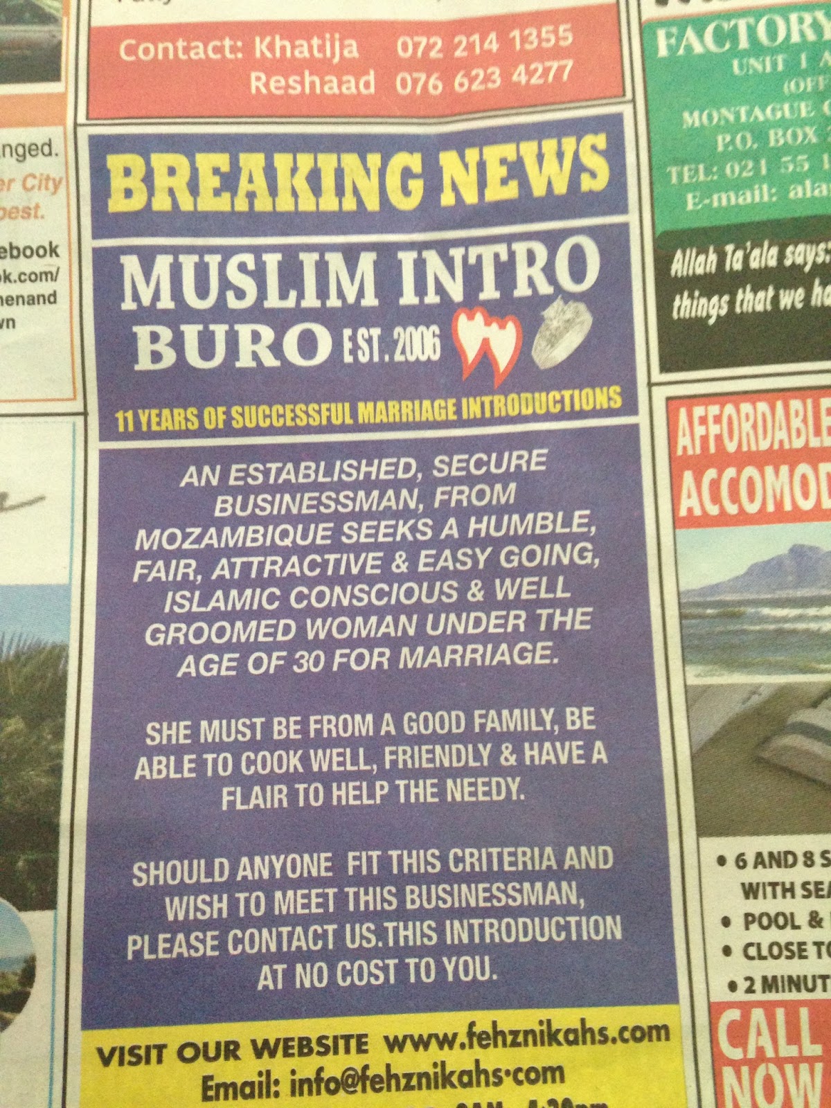 I saw your advert in The Al Qalam (March 2017) and I would love to respond to it as I too am seeking a partner for life and you sound like the perfect man.