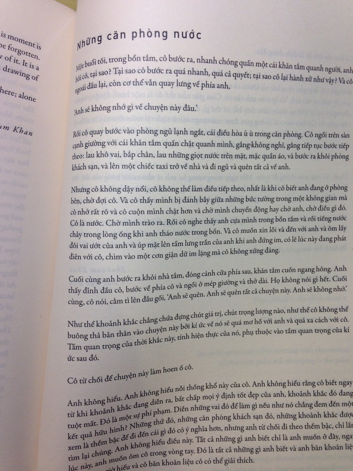 In a tub, one evening, she steps out and quickly wraps a towel around herself and he asks her, why? Why has she stepped out so fast, so determinedly; why is she behaving like this? And she turns her head, her body still facing away from him, ‘You wont remember any of this.’ And she turns away from him and steps into the cold bedroom, the air conditioner a hum in the room. She sits on the floor next to the bed with the towel wrapped around her tightly, trying not to think, trying to get on with the next step: drying her shoulders, then her calves, wiping the drops off her face, slipping on her clothes, stepping out of the hotel, taking a taxi home, falling asleep and forgetting him entirely. But she can’t get up, she can’t take the next step, not while knowing she has him there. She feels caught; caught between walls in a space she only too easily remembers and she curls herself tightly and waits to move or waits for him, waits for something. Her lungs feel squashed inside her chest and she feels like she is sipping small breaths of air. She reminds herself to breathe. She closes her eyes. She is water. She is water. She is water. And then she hears him move in the tub and the sound of water runs through the pipes as he lets the bathwater out. She wants to apologise, wake up and go to him, slip her arms around his wet shoulders and lay her face on his bare back as he stands still, perhaps angry with her, gone into one of his silent rages. She closes her eyes. She is water. She is water. She is water. Eventually he steps out of the bathroom, shuts the door behind him, a towel slung across his hips. He sees the top of her head, walks toward her and sits at the edge of the bed and sighs. Water drips onto the carpet. They say nothing. Then eventually with her chin drawn against her knees, she starts, ‘You will forget. You will forget all of this. You wont remember.’ As if the moment contained no importance, no weight, as if she could not lose herself to this because the memory of it would be too vague for him and too distinct for her. The importance of this moment, its reality, depended on the importance of its memory later. She refuses to let this stain her. She gathers her face, catches the edges before they fall. He doesn’t understand. He doesn’t understand this anguish of hers. He doesn’t understand that she knows even as the moment is happening, even despite all his good intentions, the moment is being lost. She knows this. It’s all a waste. What is the point of playing roles and investing this much if nothing will come out of it? These things, these hotel rooms, these moments are supposed to be steps to something significant but he refuses to follow the steps, only retrace them. He doesn’t understand this. All he knows is that he wants to be here right now, that he wants to hold her in his arms. That is all he knows and he wonders if he will ever understand and she wonders if she can ever explain. They circle, hover like vultures, unsure of whether to pick at bones or continue south. She sits, cold now, shivering. Wondering what she is doing here. She wishes, more than anything for the strength to stand up, for the strength to get up and just leave. Not to upset him or prove anything to herself. Just to do it because it is Right. He leans forward and puts a hand on her shoulder and that is all it takes; she feels weak, wants to swipe his hand away and hold him close at the same time and the confusion makes her feel sick. She stays still. Keeps her eyes closed. Dreams of water. He climbs down next to her on the floor; takes her face in his. And presses his forehead to hers. It feels like such a natural action but she fights against feeling anything, even though she knows she will return to it again and again later. She leans in, give in, as she always does, this giving space, this bendable creature, who will always make space in herself for him. She softens, rests her head against his, lets his hands fall around her and they sit like that for a moment and she tries not to think this moment is sacred because he will forget, and she will remember and nothing is sacred if it can be forgotten. (She is right. He will not remember. It takes him only a month to forget. One day in the future he remembers a shadow of it. It is a feeling that he cannot place; a shape with a dull outline that he grapples to fill in; a drawing of plans to a house he cannot recall even though he senses its importance.) But as she had predicted, she remembers. The drops on her shoulder. The forehead against hers. The hum of the air conditioner. The sound of water in the pipes. She is still sitting in the room, knees drawn to her chest. She closes her eyes. She is water. She is water. She is water.