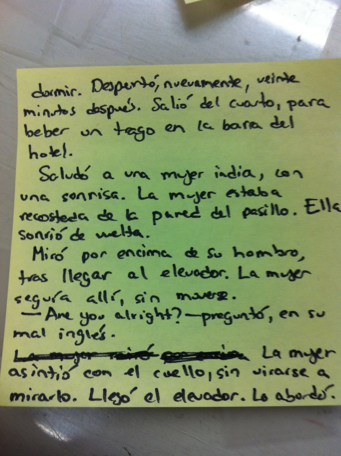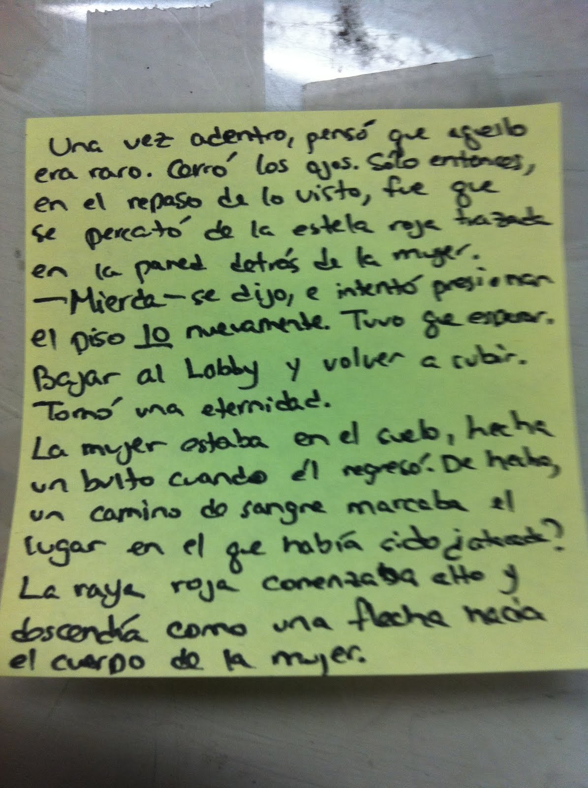 --Mierda--se dijo, e intentó presionar el piso 10 nuevamente, detener su descenso. Tuvo que esperar. Bajar al lobby y volver a subir.Tomó una eternidad.