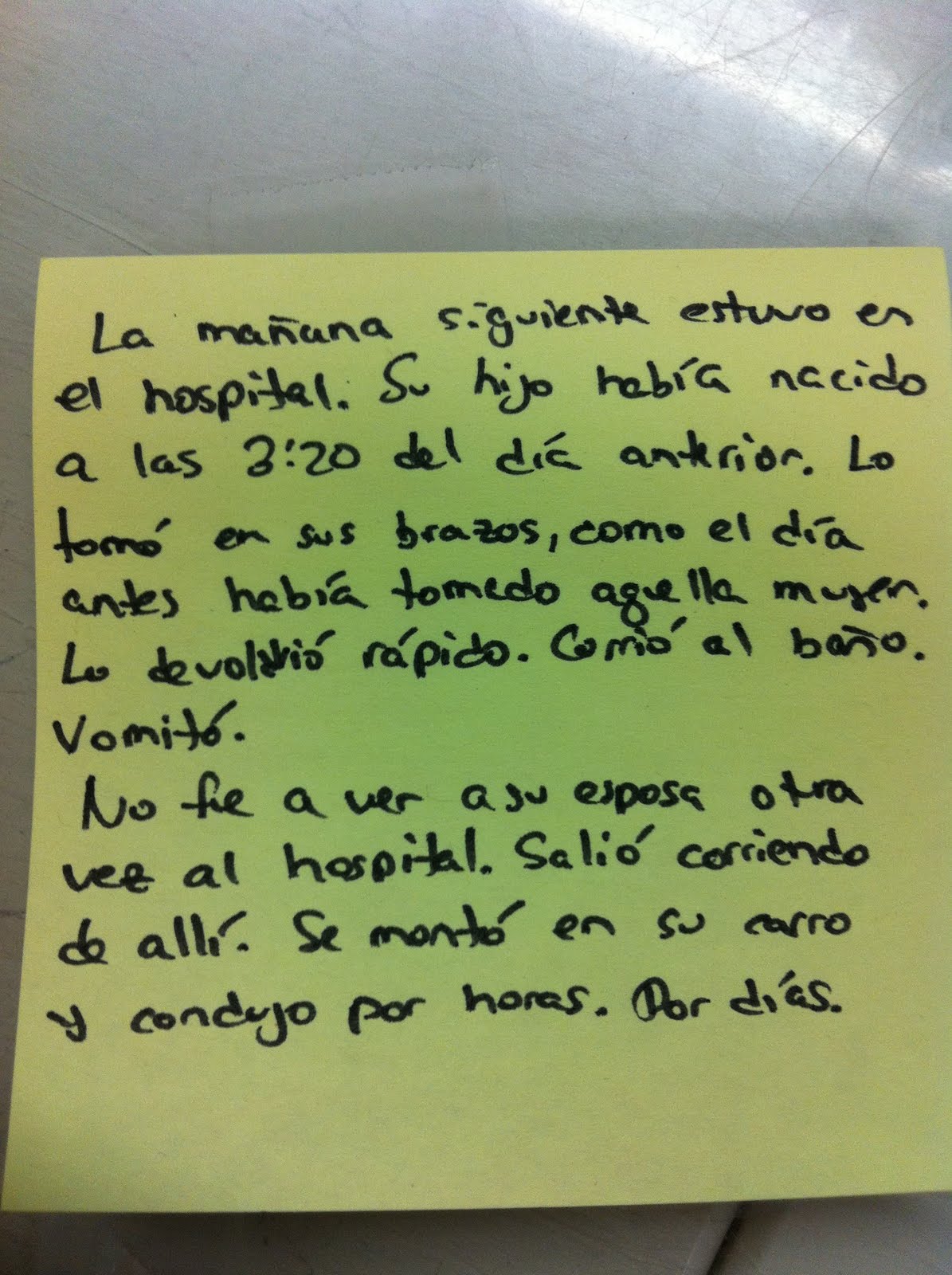 La mañana siguiente estuvo en el hospital. Su hijo había nacido a las 3:20 del día anterior. Lo tomó en sus brazos, como tantas horas antes a la mujer. Lo devolvió rápido. Corrió al baño. Vomitó.