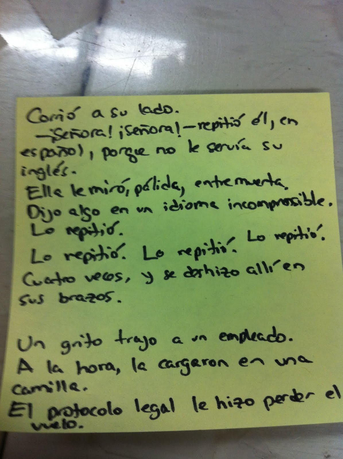 Estaba fuera del país, en Atlanta, por cuestiones de negocios. Su vuelo salía a las seis p.m. A las tres, recibió la llamada alarmada de su suegra. Por más que intentó, no pudo cambiar su reservación a una más temprano. Regresó a su habitación en el hotel y tomó una siesta, para calmar los nervios.Quince minutos después, lo despertó un alarido. Pensó, equivocadmaente, que se trataba de un sueño de los que tenía cuando niño. Volví a dormir.
