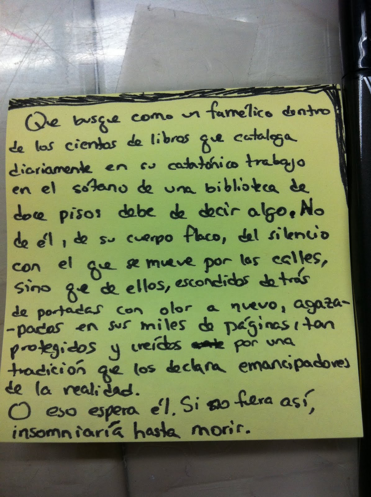 Que busque como un famélico dentro de los cientos de libros que cataloga diariamente en su catatónico trabajo en el sótano de una biblioteca de doce pisos debe de decir algo. No de él, de su cuerpo flaco, o del silencio con el que se desplaza por las calles. No, debe decir algo de ellos, escondidos detrás de portadas con olor a nuevo, agazapados en sus miles de páginas, tan protegidos y consentidos por una tradición que los declara emancipadores de la realidad y de sus hombres.