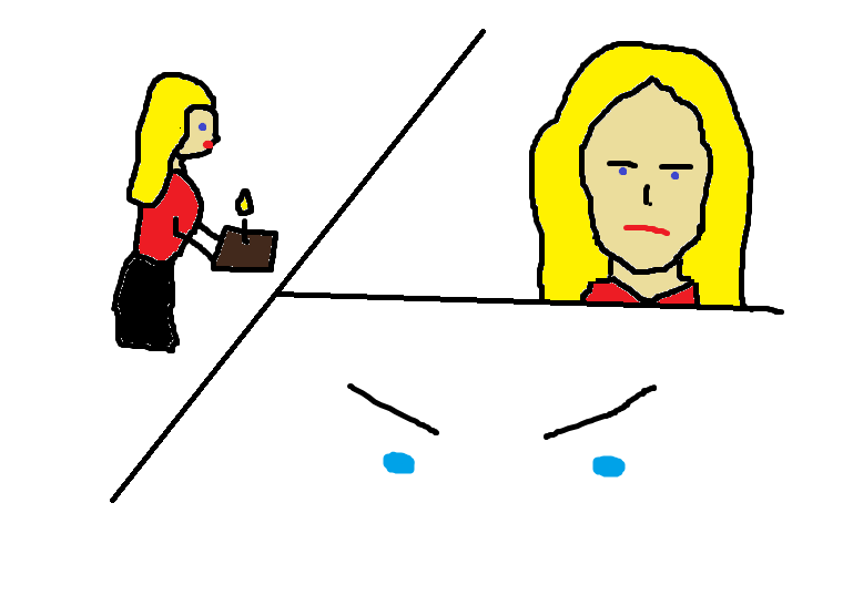 Shelley stepped forward, cake in hand. "Happy birthday!"