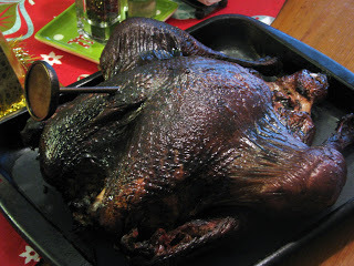gizzard and liver in the bird can impart a pungent flavor as well as bringing out the smoke