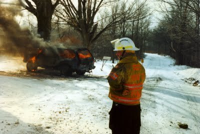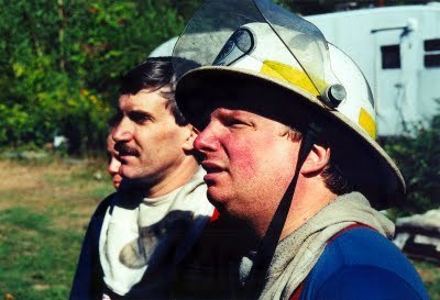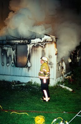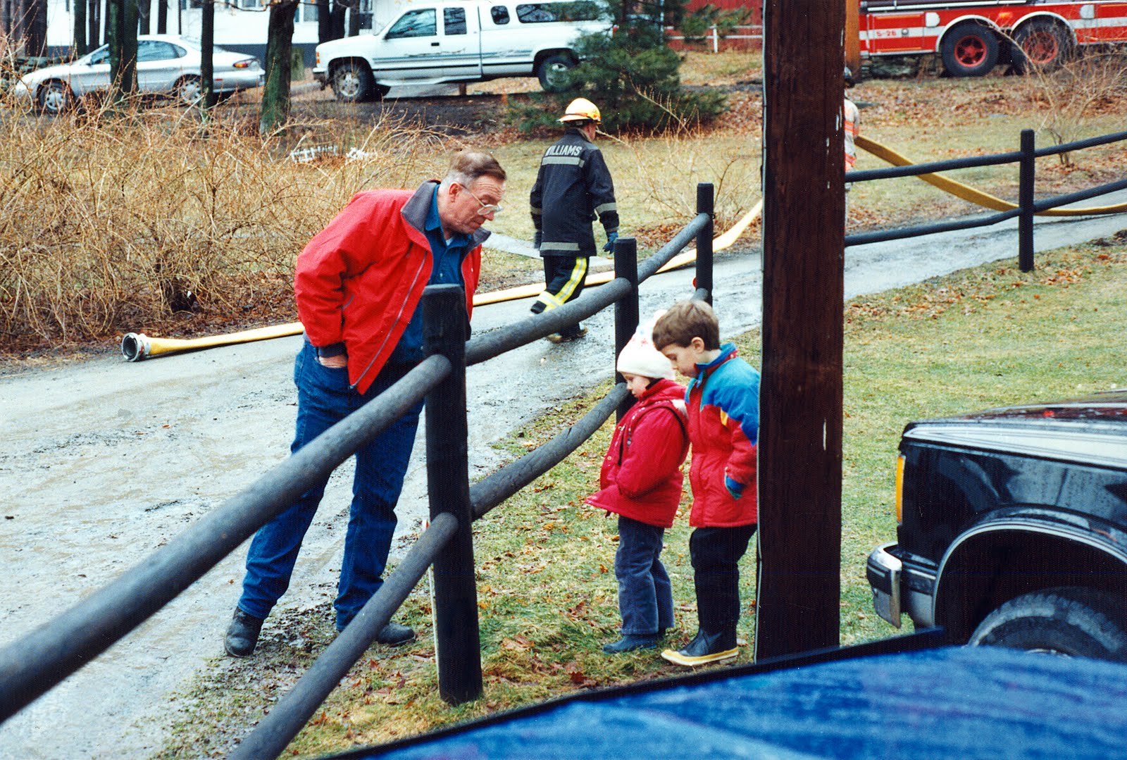 I walked up to the road and the kids were still watching from the car, wide-eyed, under Smackie's supervision. Conditions were safe enough that I could take them down with me and they could stand next to the engine and watch. One on each side, we held hands and walked down. They stood perfectly still next to the engine while I dealt with the details of the fire. Soon we were able to start returning companies and began breaking down the fill and dump sites.Both kids were polar opposites at that age. Mike was shy and didn't talk much while Megan, like her mother, would talk to a dead man. Actually, not much has changed since then. After a while, Billy, the pump operator, took a break and bent over to talk to the kids. I didn't hear any of the conversation but when he stood back up he was laughing. Later I learned he had asked how they were doing. Mike was silent, knowing his little sister would talk for both of them. She proudly announced in her three-year-old voice, "This is my first structure fire." It wasn't the last.