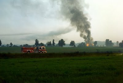 Only a couple miles from the scene, we arrived to find an old two story farmhouse with heavy fire blowing from the windows on the first floor. It probably was on the second as well, but we couldn't tell at this point. We put on our gear while awaiting the first engine.
