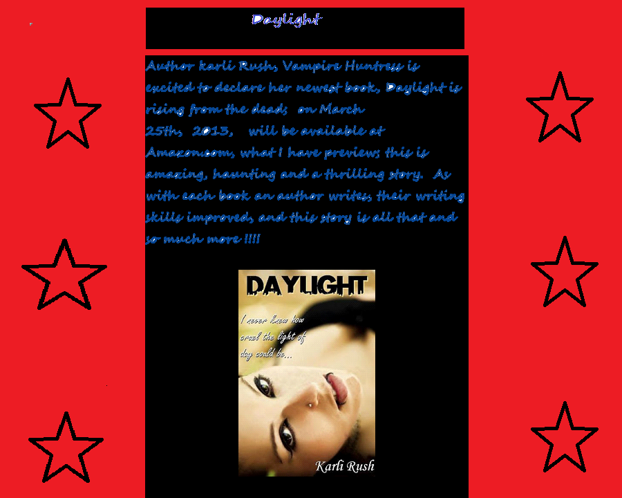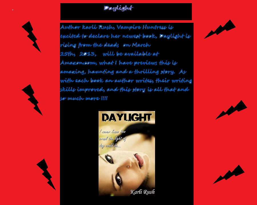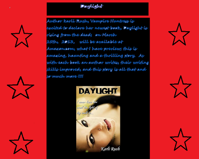 Author karli Rush, Vampiric Huntress is excited to declare her newest book, Daylight is rising from the dead; on March 25th, 2013, will be available at Amazon.com, what I have preview; this is amazing, haunting and a thrilling story. As with each book an author writes, their writing skills improved, and this story is all that and so much more !!!!