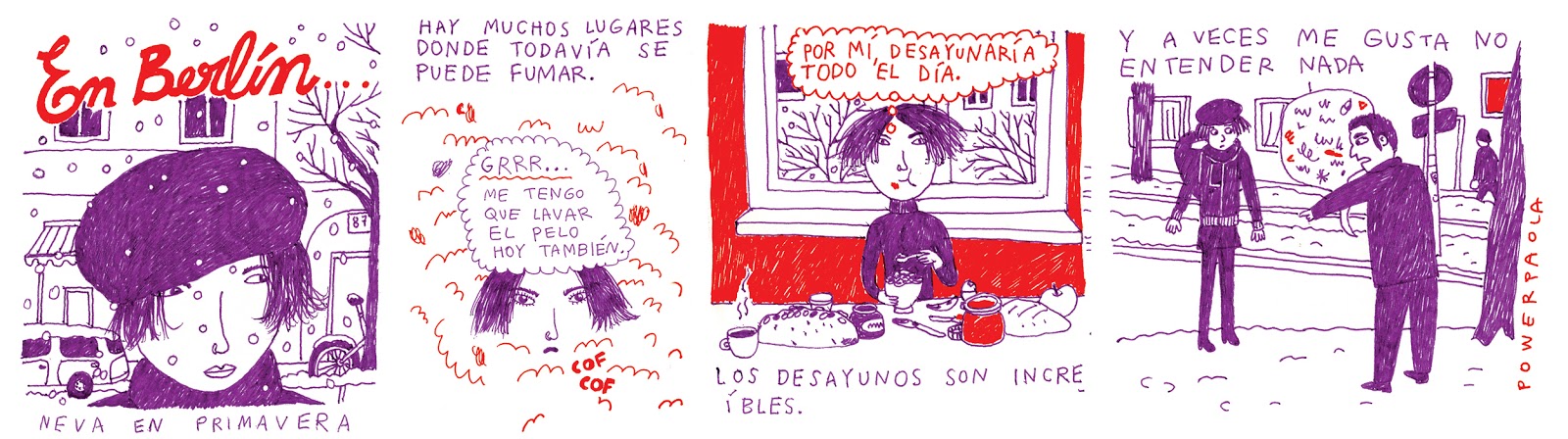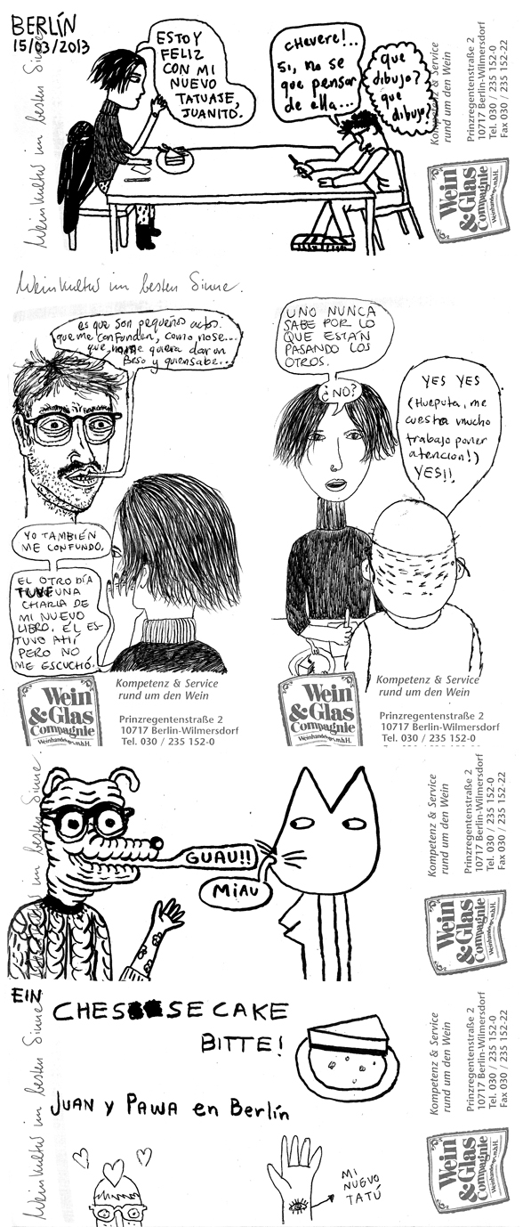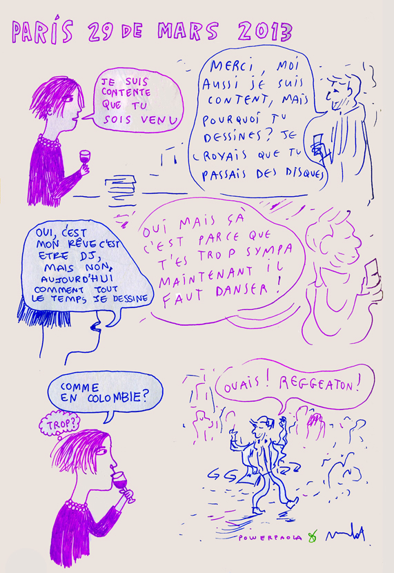 p: Estoy muy contenta de que hayas venido.m: Gracias, yo también estoy contento, pero por qué dibujas? Yo pensé que ibas a ser DJ esta noche.p: Sí, es mi sueño ser DJ, pero no, hoy como siempre estoy dibujando.m: Sí pero eso es porque eres demasido simpática, ahora mejor vamos a bailar.p dice: ¿Cómo en Colombia? p piensa: ¿Demasiado?m: ¡Sí, Reggeaton!