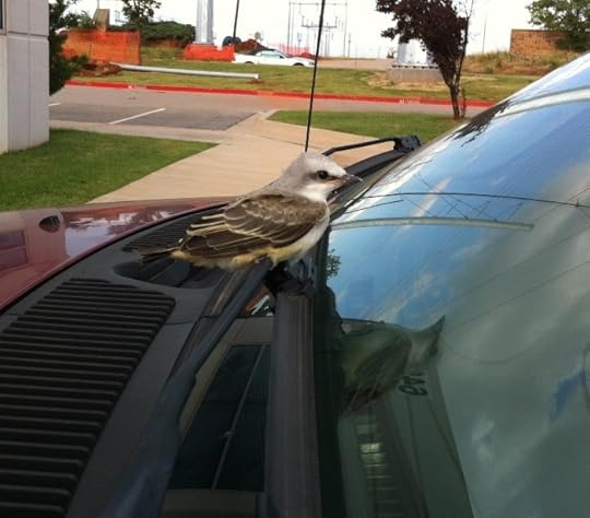 I didn’t spot this baby bird until I had already started the truck’s engine. He (or she) let me get just as close as I wanted, until I tried to get it to jump to my finger. Then she leapt into the air, flapping her wings eratically and violently, and an updraft carried her up and over the building in front of my truck. I don’t know what kind of bird it is, but I have (sort of) ruled out goldfinch and meadowlark. Still, I can’t explain the yellow feathers (down?) on its undersides.