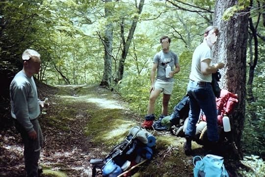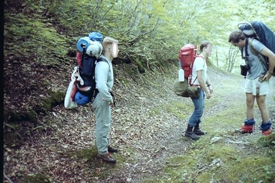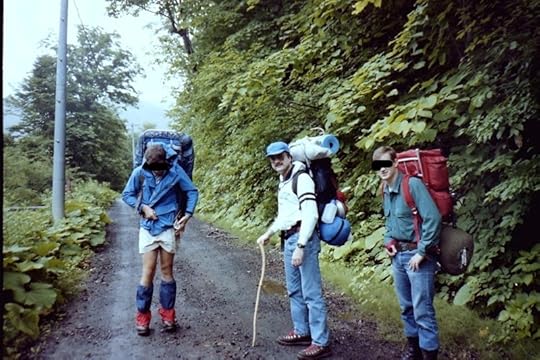 Here I am with full pack and a walking cane I bought in a local shop. Apparently, the cane was a bit short for me, as I appear to be hunched over just a skosh (chotto sukoshii). I opted for the long pants, rather than the shorts and gaiters, even having spent five years in Denver, since I had spent most of my life in tick-laden Oklahoma. I see I was sporting my mountain hiking boots, however. My Atlantic City sweatshirt completes the ensemble.