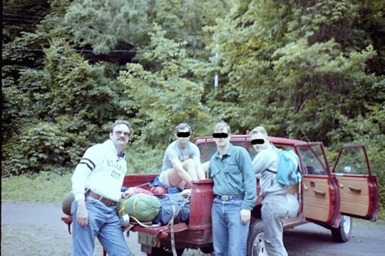 Here I am (on the left–the one without the Zorro mask) with a few friends, ready to hit the trail to the waterfall in northern Japan. This was an overnight hike–note all the equipment in the bed of the truck.