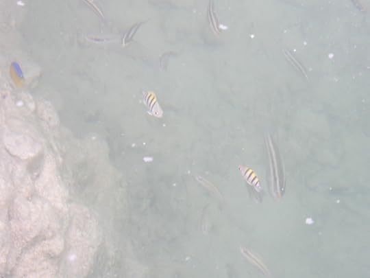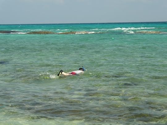 Here I am, examining the ocean bottom in the clear waters inside the semi-protected area bounded by a breakwater constructed from giant sand-filled bags. They pumped the sand through a pipe to fill the bags, and at first glance they appear to be beached whales.