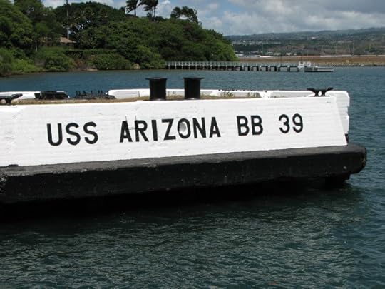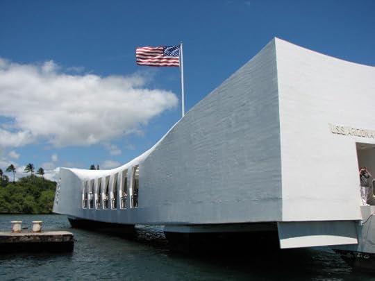 Here is the USS Arizona Memorial the way it looks as you approach it on the ferry. It spans the wreck of the ship as if it were a bridge.