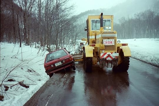 In this shot you can see how the wheels on the right side (the driver's side) of my car were not even touching the road. The ditch was deeper than it looked. When the grader finally pulled my car free, it rolled into the yellow monster and got a nice dent in it's right-front fender, just above the parking light. The driver didn't mind taking my offer of 5000 yen (about $35), so no fast track to Nirvana for him. You can't tell much about him in this photo, but the other two gentlemen (never caught their names) have now been immortalized in my blog. Domo arigato gozaimashita, tomodachi!
